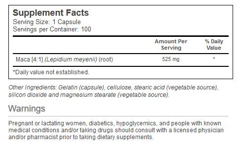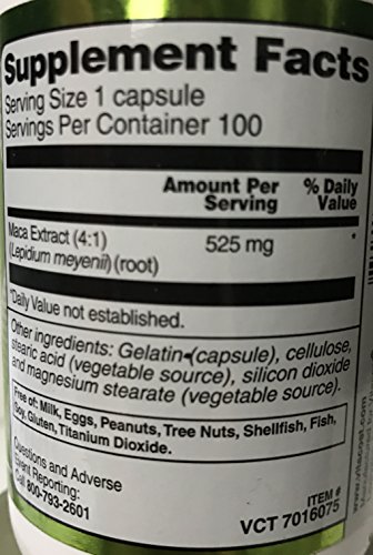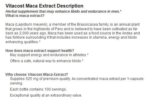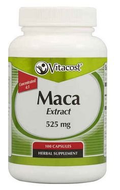 What is maca extract?Maca (Lepidium meyenii), a member of the Brassicacea family, is an annual plant that grows in the highlands of Peru and is believed to have been cultivated as far back as 2,000 years ago. Maca has been used as a food source in the Andes and has folklore surrounding it that includes increases in stamina, energy and libido enhancing qualities.* How does maca extract support health?May support energy and endurance in athletes.* Offers a safe, natural way to enhance libido.*Why choose Vitacost Maca Extract?Supplies 525 mg of premium-quality, 4x-concentrated maca extract per 1-capsule serving.Each bottle contains 100 servings.Exceptional quality at an extraordinary value.VitacostAll Vitacost products are laboratory tested to meet FDA standards for identity, purity and composition. All products are tested for heavy metals, microbiology and contaminants. Vitacost products are produced in a NSF Certified facility. Freshness is guaranteed. *These statements have not been evaluated by the Food and Drug Administration. This product is not intended to diagnose, treat, cure or prevent any disease.Feature