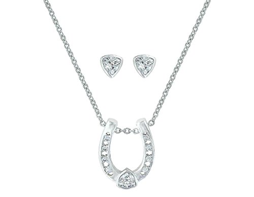 A jewelry set from Montana Silversmiths displays the beauty of the western spirit. This dazzling Lucky Trillion Treasure Horseshoe Jewelry Set features a horseshoe pendant with bright silver finish and four small round cubic zirconia on each side with a larger trillion cubic zirconia on the base. Exude style and sophistication with this jewelry set from Montana Silversmiths.Feature