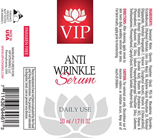 Studio : VIP VITAMINS Publisher : VIP VITAMINS Binding : Misc. Product Description Face toner women - ANTI WRINKLE SERUM - Anti aging skin serum - 6 Bottles ANTI WRINKLE SERUM - WRINKLE REMOVER: Provides natural support to and rejuvenates your skin to prevent, reduce and eliminate Our product's potent and highly concentrated formula was specifically designed to: A. Provide natural skin support B. Repair and rejuvenate your skin C. Prevent, reduce, and remove wrinkles D. Prevent and slow down premature aging of the skin E. Restore elasticity and firmness to the skin ANTI WRINKLE SERUM - ELASTIC HEALTHY SKIN: Is beneficial for transform aging areas of your skin, especially around your eyes and affected by into a shining, clean, elastic and healthy skin. Our highly formulated formula hydrates the skin, provides all around care and protection to the eye area. ANTI WRINKLE SERUM - ANT-AGING SKIN HEALTH: Gives your skin in the delicate eye area a chance to prevent and combat premature aging naturally! DIRECTIONS: After cleansing, apply serum to skin twice daily, avoiding sensitive eye areas. For best results, apply prior to moisturizing. CAUTION: For external use only. Discontinue use if excessive redness or irritation occurs. Keep out of reach of children. Our Product has not been tested on animals! 0