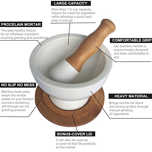 ✔ BAMBOO BASE PLATE: The bamboo base plate keeps the mortar stable and also works like a coaster so your table will keep dry and clean. It can also be used as a cover lid that fits perfectly on the mortar.