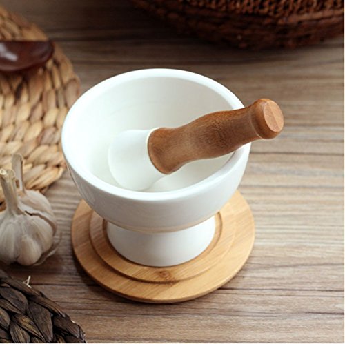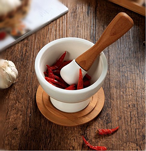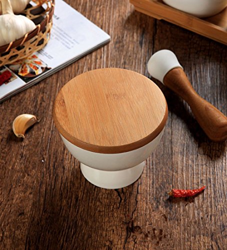 Porcelain Mortar and Pestle Set With Bamboo Base Plate(Can Also Be Used as a Lid),4.7", White