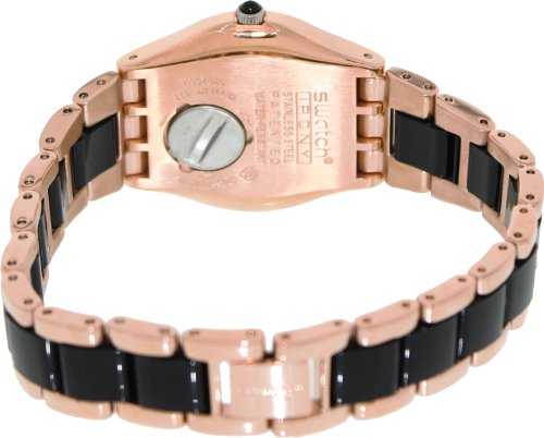 -. Title : Swatch YLG123G rose pearl black dial two-tone metal bracelet women watch NEW