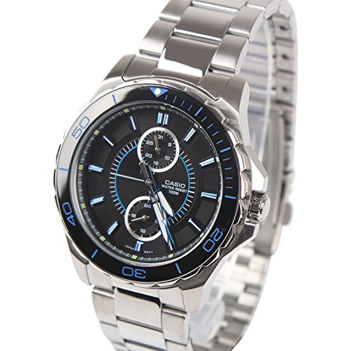 Brand, Seller, or Collection Name:Casio Model number:MTD-1077D-1A1VDF (A889) Part Number:MTD-1077D-1A1 Item Shape:Round Dial window material type:Mineral Display Type:Analog Case material:Stainless steel Case diameter:49 millimeters Case Thickness:11 millimeters Band Material:Stainless Steel Band width:20 millimeters Band Color:Silver Dial color:Black Calendar:Yes Special features:N/A Item weight:7.36 Ounces Movement:Quartz: Battery Water resistant depth:100 Meters