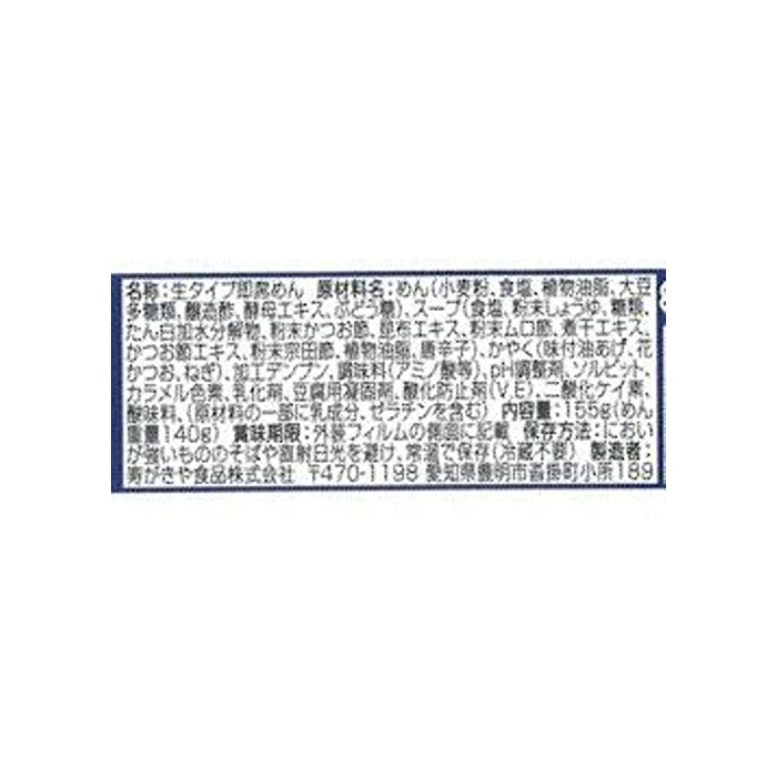 원재료:면(소맥분,식염,식물성 기름지,대두다 당류,양조초,효모 엑기스,포도당)고, 스프(식염,분말 간장,당류,단백 가수분해물,분말 가다랭이절,다시마 엑기스,분말《무로》절,자간엑기스,가다랭이절 엑기스,분말종 전절,식물성 기름지,고추)고, 인지(든가) 질투하다(맛을 내는 솜씨유 주고,화가다랭이,파)고, 가공 전분,조미료(아미노산등)고, pH조정 제,솔 비트,카라멜 색소,유화 제,두부용 응고 제,산화 방지제(V.E)고, 2산화 규소,신맛료,(원재료의 일부에 유성분,젤라틴을 포함한다)
