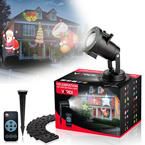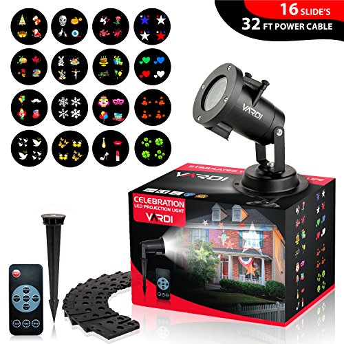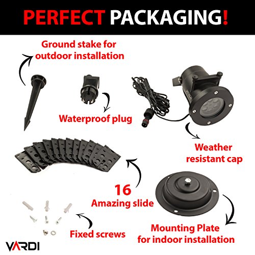 - SATISFACTION GUARANTEE: We strive to provide you with the highest quality product, so if you're not entirely satisfied, please contact us to rectify the issue quickly; BUY WITH CONFIDENCE the VARDI CELEBRATION LED PROJECTION LIGHT that comes with the LED Light, 16 Decorative Slides, Remote Control, Ground Stake, Mounting Plate, and Instructions in a Gift Box; surprise your loved ones with the immortal LED projection light that passes from celebration to celebration.