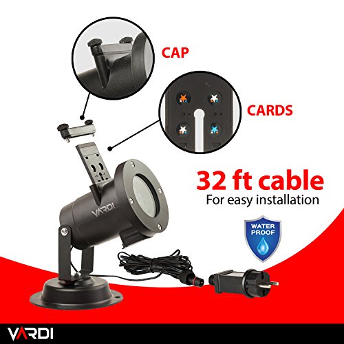 - SIMPLICITY AND EASE OF OPERATION: Taking approximately 4 minutes to install, the VARDI OUTDOOR AND INDOOR PARTY LIGHT is easy to assemble out of the box by inserting the desired decorative slide into its screwed-in slot, adding the ground stake or mounting plate, and plugging in the 32 foot power cable with a water-resistant cap, 2-prong adapter, and power supply transformer; arrange the light wherever you want and get in the holiday or festive spirit no matter what the occasion.