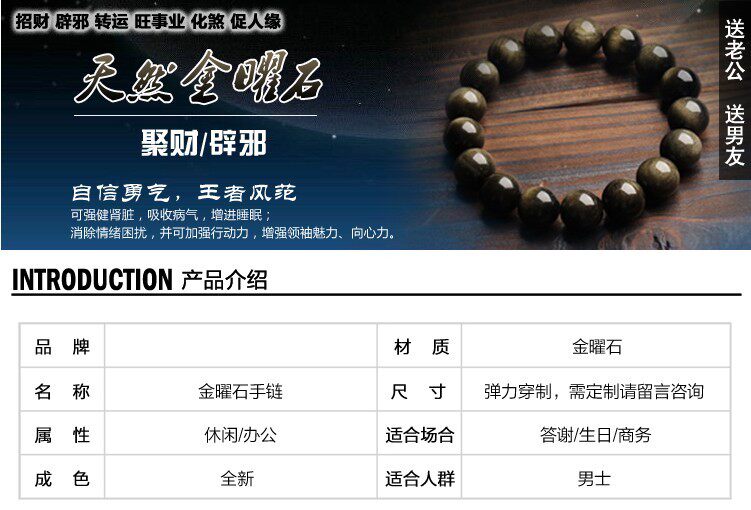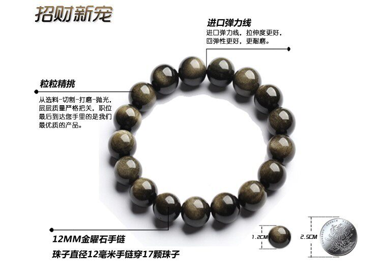 Gold and is Yaoshi and obsidian lines out of the same clan goldenChlamydia enthusiasm is bold and unrestrained shining gold light calledlucky new favorites. Gold Yaoshi can enhance the vitality the restoration ofhuman spirit physical strength the excessive use of the brain workers andcreative workers have balance effect very good; be strong kidney disease gas absorption improve sleep; for drinking smoking drug addiction hasimprovement effect; can make the person is sedate relieve pressure, be in a calm mood eliminate the emotional distress, and can strengthen theaction force enhance the charisma the centripetal force. This braceletbody black selected for the insulation to ward off evil spirits the goldenflash significantly, up enrichment lucky meaning, the two combined highly collectible significance.