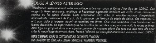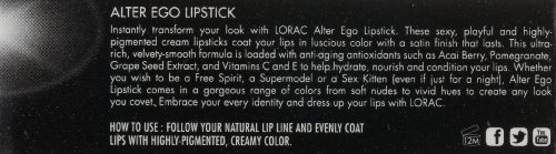 Instantly transform your look with LORAC Alter Ego Lipstick. These sexy and playful lipsticks coat your lips in highly-pigmented color with an opaque, matte finish. Alter Ego Lipstick contains antioxidants such as Acai Berry, Pomegranate, Grape Seed Extract, and Vitamins C and E. Whether you wish to be a Free Spirit, a Supermodel or a Sex Kitten (even if just for a night), Alter Ego Lipstick comes in a gorgeous range of colors from soft nudes to vivid hues to create any look you covet. Embrace your every identity and dress up your lips with LORAC.Feature