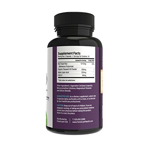 -. Feature : PROMOTES HEALTHY CHOLESTEROL: Red yeast rice helps lower bad LDL cholesterol levels and raises good HDL cholesterol levels, for a healthy heart and an improved quality of life. / SUPPORTS METABOLIC FUNCTION: In addition to promoting a healthy cardiovascular system, red yeast rice helps maintain a healthy metabolism, a vital component of one's daily diet. / SPECIALLY FORMULATED: Each serving provides 1215mg of Red Yeast Rice, 300mg of Organic Flaxseed Oil Powder, 225mg of Alpha Lipoic Acid, 60mg of COQ10 and other all natural ingredients. / SAFE INGREDIENTS: This all natural cholesterol supplement is NON-GMO, vegetarian & free of common allergens, including gluten, dairy, eggs and nuts. Produced in a GMP/FDA approved facility / 30 DAY SUPPLY: Included are 90 capsules. As a daily supplement, with a sested dosage of 3 capsules per day, that's enough for a month. For best results, continue use for 60-90 days.