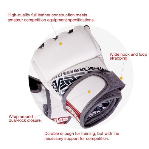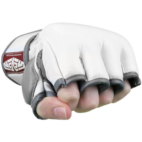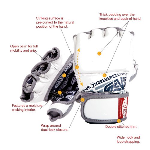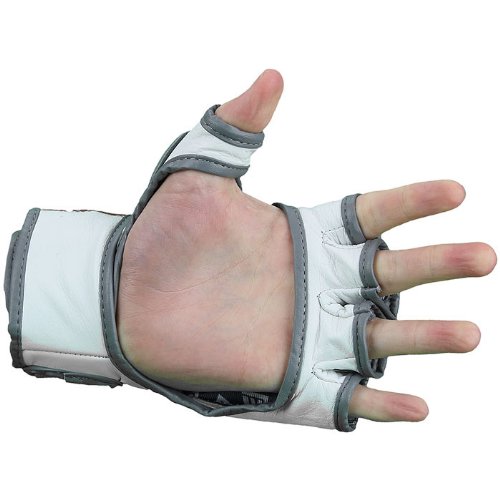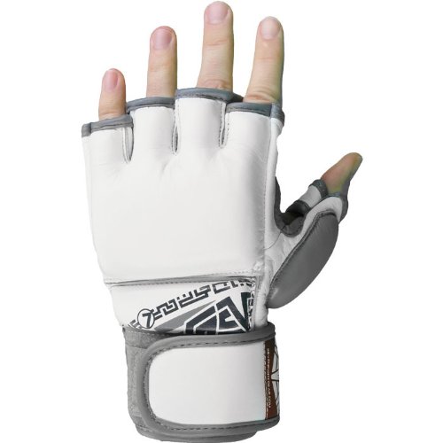 -. Binding : Misc. -. Brand : Seven7 -. Color : White -. Feature : Thick padding over the knuckles and back of the hand / High-quality full leather construction / Open palm for full mobility and grip / Wrap around dual-lock closure / Striking surface is pre-curved to the natural position of the hand -. Label : Seven -. Manufacturer : Seven -. ProductGroup : Sports -. ProductTypeName : SPORTING_GOODS -. Publisher : Seven -. Studio : Seven -. Title : Seven Fight Gear MMA Hybrid Glove White Small