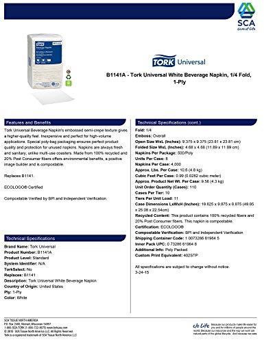 -. Title : Tork Universal B1141A Beverage Napkin, 1-Ply, 1/4 Fold, 9.38" Width x 9.38" Length, White (Case of 8 Packs, 500 per Pack, 4,000 Napkins)