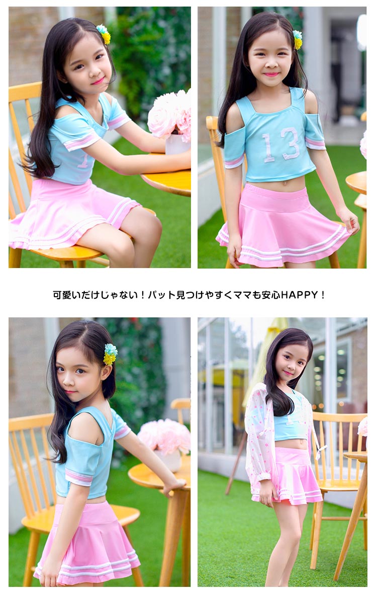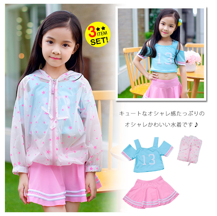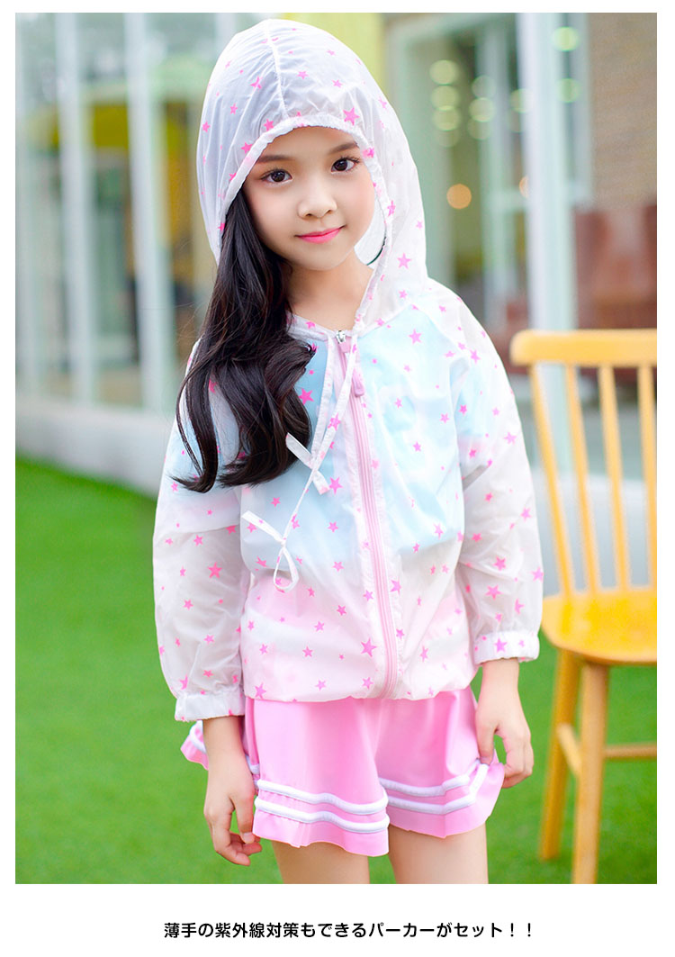 | キュートなオシャレ感たっぷりのオシャレかわいい水着です♪薄手の紫外線対策もできるパーカーがセット!!可愛いだけじゃない!パット見つけやすくママも安心HAPPY!サイズも取り揃えておりますので、ご安心くださいネ♪ | |