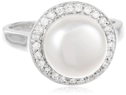 Faceted cubic zirconia stones line a button-shaped freshwater cultured pearl, creating this classic halo-style ring design.Feature