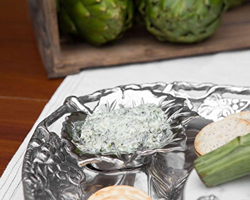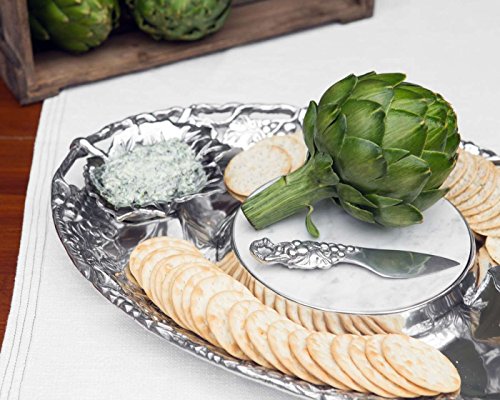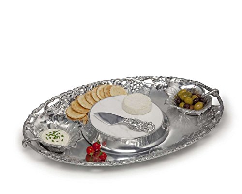 Perfect for cocktail parties, special luncheons, or the buffet, this Arthur Court 5-piece grape entertainment tray is a stunning work of art, and a versatile, functional serving set. The base tray has a beautiful grape motif, measures a dazzling 20-inch long, and features a depression in the center that houses the round, removable marble cheeseboard. Also included are two matching removable dip bowls with handles that rest against the ends of the tray, and a coordinating grape handled cheese knife. This set makes a striking ensemble for serving antipasti, cheese and crackers, chips and dips, or a fruit and cheese platter. The metal is manufactured with Arthur Court's signature aluminum alloy with a brilliant finish. Look for a wide assortment of coordinating grape pieces in the Arthur Court collection. Packed in an attractive gift box.Feature