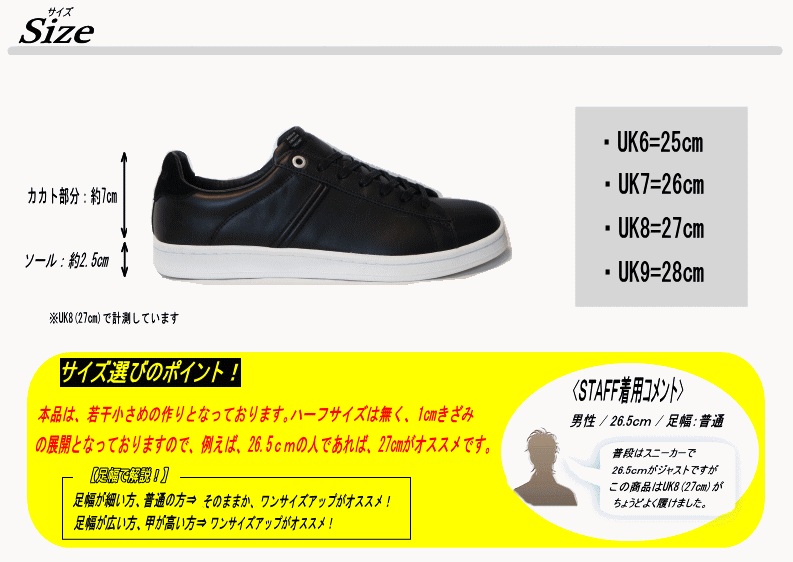 | サイズ | 作り⇒少し小さめ 【サイズ選びのポイント!】 足幅が細い方、普通の方⇒そのままか、1サイズアップがオススメ! 足幅が広い方、甲が高い方⇒1サイズアップがオススメ! |