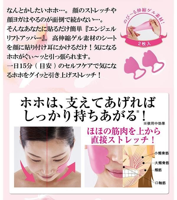 なんとかしたいホホ…。顔のストレッチや顔ヨガはやるのが面倒、続かない…。そんなあなたに貼るだけ簡単「エンジェルリフトアッパー」。高伸縮ゲル素材のシートを顔に貼り付け耳にかけるだけ!気になるホホがぐぃ~っと引っ張られます。1日15分を目安に、セルフケアで気になるホホをグイッと引き上げストレッチ!! |