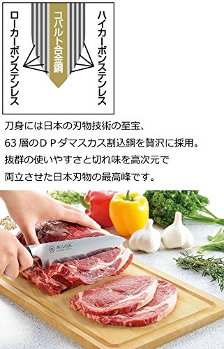 제조국:일본 소재 재질:도몸:DP다마스커스 복합재(심재료:코발트 합금강)핸들:적층강화재(금속부:18-8스테인레스강) 상품크기:전장 약31.5cm칼날 길이 약18cm 중량:약245g 사양:식기 세척기:사용 불가
