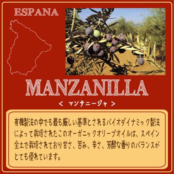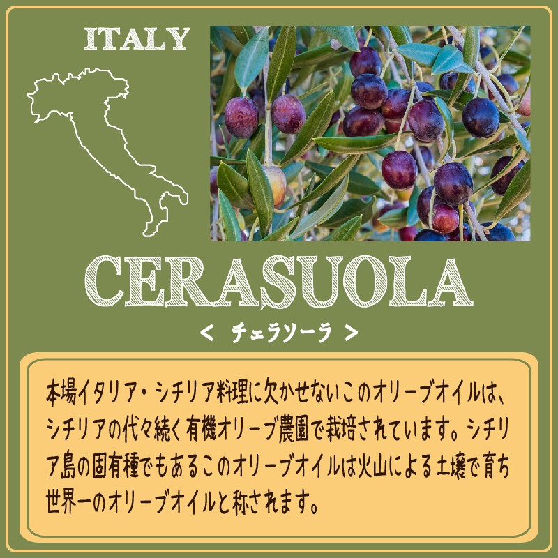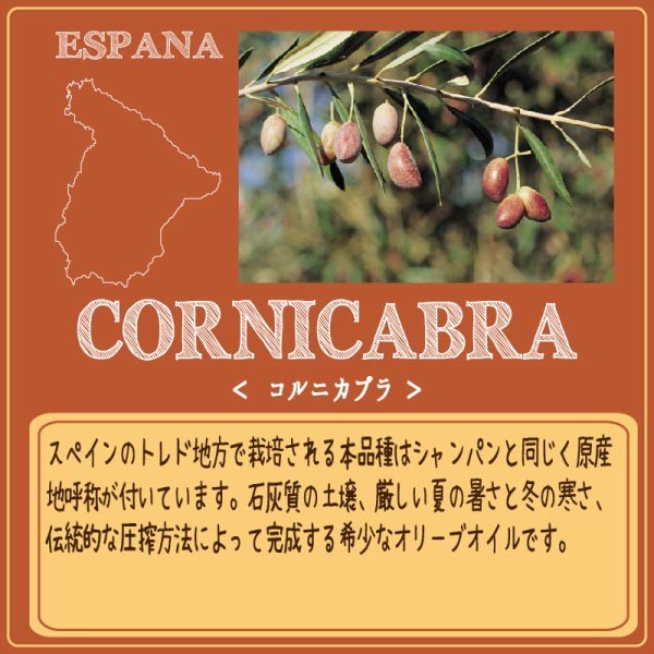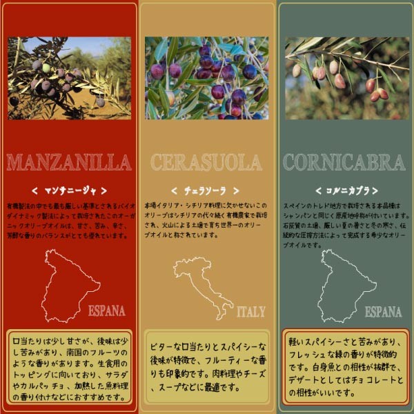 今、大注目のオリーブオイル!地中海料理の代表的なオイルで健康をサポートするオイル!そんなオリーブオイルを国ごとにCornicabra- (コルニカブラ)スペイン味・香り フレッシュグリーンの香りと、リンゴのようなフルーティさ、ポリフェノールの刺激のバランスの良さが特徴的です。用途 白身魚との相性が抜群で、デザートとしてはチョコレートとの相性がいいです。Cerasuola(チェラソーラ) イタリア 味・香り ビターな口当たりとスパイシーな後味が特徴的です。フルーティな香りもしっかり持っています。用途 肉料理やチーズ、スープなどに最適なオリーブオイルです。Manzanilla (マンサニージャ)スペイン味・香り 口当たりは少し甘さがあり、後味は少し苦みがあるのが特徴です。南国のフルーツのような香りがあります。用途・生食用のトッピングに向いており、サラダやカルパッチョ、加熱調理した魚料理の香り付けに少量たらすのもお勧めです。エキストラバージンオリーブオイルにはオレイン酸・ビタミンEや食物繊維も含まれていますので、日々の健康には欠かせないオイルです。名称:オリーブオイル内容量:20ml×3本