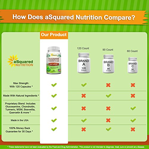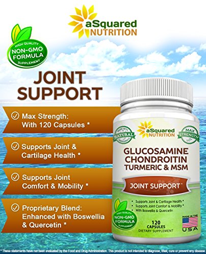 MAX STRENGTH JOINT SUPPORT: aSquared Nutrition's maximum strength Joint Support formula contains a unique blend of Glucosamine Sulfate, Boswellia Extract, Chondroitin Sulfate, Turmeric, Quercetin, Methionine, MSM (Methylsulfonylmethane), and Bromelain. Our unique complex contains 120 Veggie Capsules per bottle for a full 40 Day Supply! *