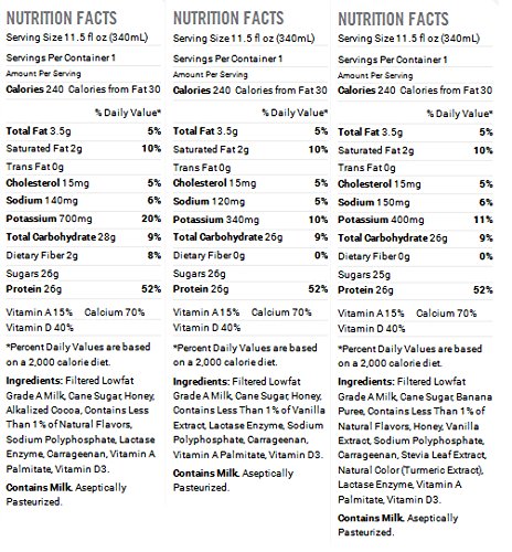 -. Feature : This is a bundle of 9 bottles, there are 3 11.5 FL oz bottles per flavor: Vanilla, Banana, and Chocolate / All three flavors are packed with 26 grams of protein