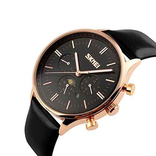 -. Title : Mens Unique Casual Analog Classic Quartz Watch Business Leather Band Waterproof Stainless Steel Case, Qual Dial Month, Week, Date, Moon Phase Black