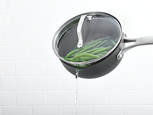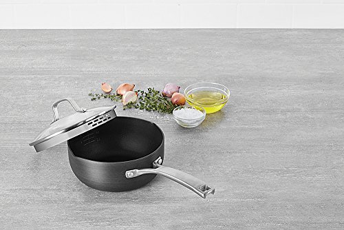 The Calphalon Classic Nonstick 2-Quart Chef's Pan with Cover features convenient fill lines, a straining cover, and pour spouts to help you save time in the kitchen. The medium size chef pan is made with dual-layer nonstick for extra-easy food release and cleanup, and is constructed from durable hard-anodized aluminum for fast and even heating. Featuring a rounded bottom, the multi-purpose non stick chef's pan is a great choice when making sauces or soups. The open shape of this nonstick cookware allows for easy stirring and is finished with a long, stay-cool stainless steel handle.Feature