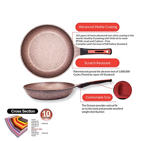 This new iNoble Non-Stick Coating is done by a different and innovative coating method. Traditional layer-based coatings are easily broken but this pan has powerful coating strength based on strong combination-structure of numerous coating particles. An excellent non-stick pan that requires a lot less oil and you can start cooking healthy by eliminating extra calories from the use of fatty oils or butter. Made in Korea Innovative inoble coating cooking surface delivers enhanced heat distribution and unprecedented non-stick performance without releasing harmful fumes or toxins at high temperatures.Innovative inoble coating cooking surface delivers enhanced heat distribution and unprecedented non-stick performance without releasing harmful fumes or toxins at high temperatures.
