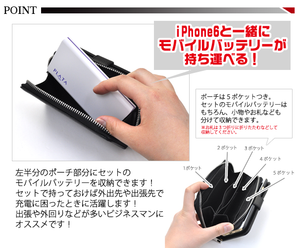 | セットのモバイルバッテリーが収納できるiPhone6用のケースポーチ! 左側はポーチになっていてモバイルバッテリーが収納可能。 右側はiPhone6が収納でき、カード収納が3枚ついています。 ケースはマグネットで取り付けてありますので、取り外し化可能! 操作するときには取り外すことができます。 背面がマグネットなので冷蔵庫にはってレシピを見ながらお料理もできます。 またストラップホールとストラップがついています。 モバイルバッテリーは、大容量5200mAh! 薄さ約13mm、重さ約133gと、持ち運んでも気にならないサイズです。 4個のLEDでバッテリー残量が確認できるインジケーター機能がついており、 蓄電は付属のmicroUSBケーブルをUSBポートに接続するだけです。 ポーチケースのカラーはブラックとレッドの2色から、 モバイルバッテリーはピンク・ホワイト・ブラックからそれそれ選んでご注文ください。 ※iPhone6は付属しません。 ※ライセンス商品ではありません。 |
