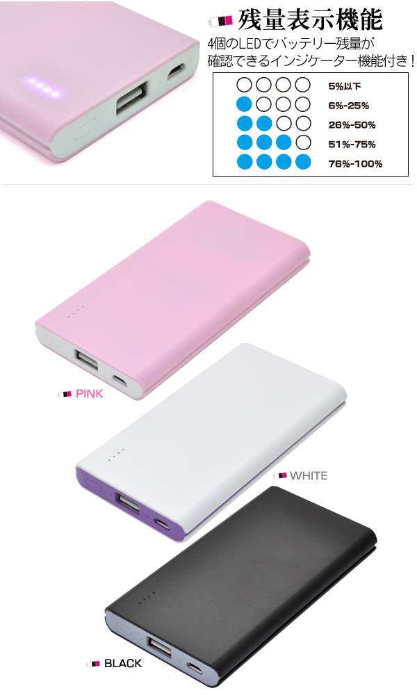 | モバイルバッテリー製品仕様 | | サイズ | 約H117×W62×D13mm | | 重量 | (約)133g | | 容量 | 5200mAh | | 入力電圧(microUSB) | 5V 1A | | 出力電圧(USB×2) | 最大:5V 1A | | 付属品 | microUSBケーブル | | 蓄電時間 | USB:約24時間 AC:約12時間 | | 繰り返し使用回数 | 約200~300回 | | カラー | ホワイト/ブラック/ピンク | | 注意 | ※ライセンス商品ではありません。 ※スマートフォンは付属しません。 |