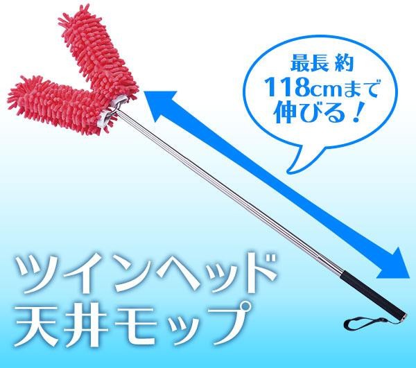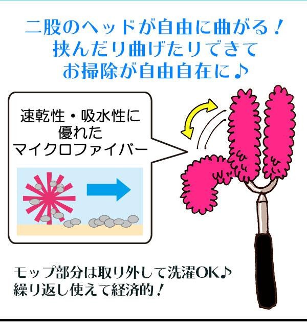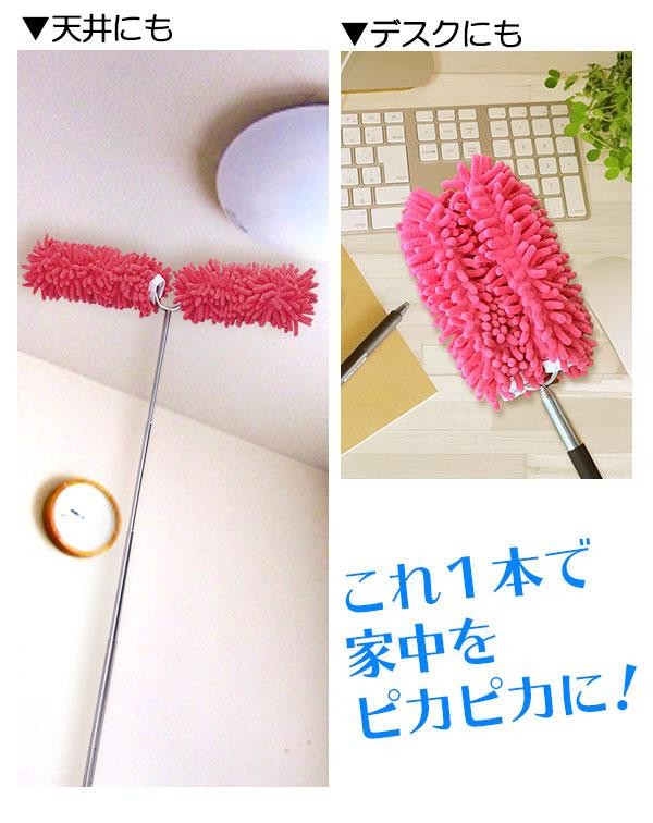 伸縮自在で最長約118cm!天井の凸凹もラクラクお掃除。便利な二股のヘッドは、挟んだり曲げたりできて自由自在。お掃除の効 率が上がること間違いなし!モップ部分は吸着性・吸水性に優れたマイクロファイバーを採用。これ1本で家中をピカピカに!※サイズは多少変動しま す。 |