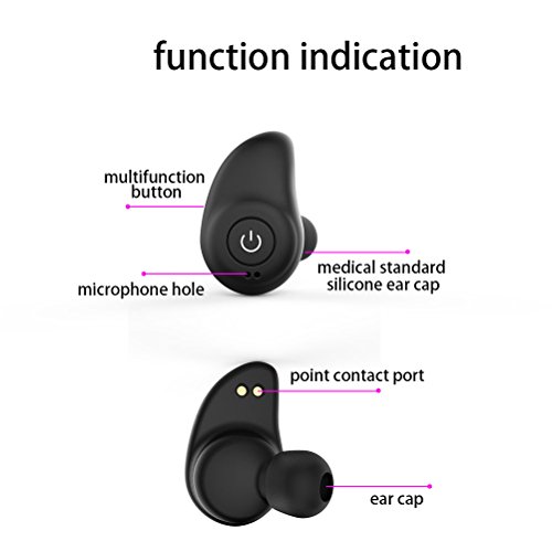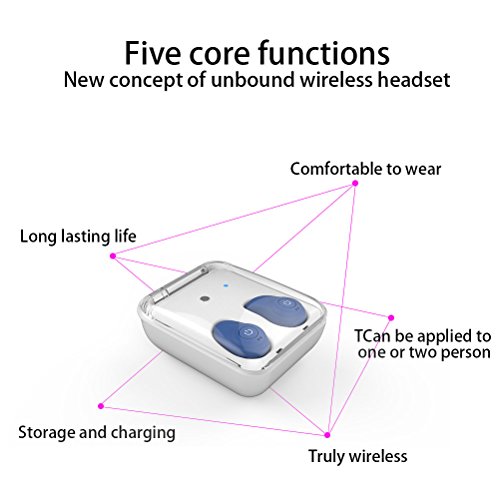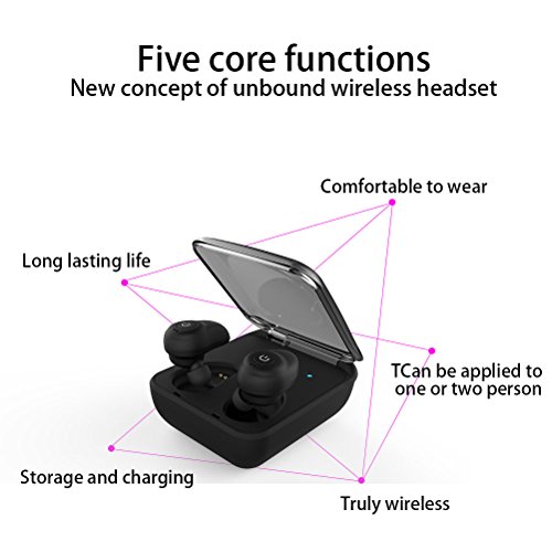-. Feature : Complete Wireless in Couple:Say goodbye to annoying earbud cables with the new True Wireless Bluetooth Earbuds, No strings attached, these wireless earbuds are actually wireless and sound awesome / Breakthrough innovation: Using Bluetooth 4.2 streaming technology, this is a breakthrough in portable music technology, able to offer quality sound without a single cable between the earpieces or the device to create a genuine feeling of freedom and flexibility / Great Sound: Clean,clear and precise sound is created by 8.6mm high power drivers that deliver rich bass, balanced mid-range and crystal clear treble frequencies for an authentic musical experience across a frequency range of 6Hz - 22kHz. / Comfort and on-the-go: The shape and the stabilizer design of this earphone have been carefully considered according to ear geometry to ensure a secure, comfortable fit. The right earphone also includes a microphone for hands-free calling and can be used with any Bluetooth-enabled device. The accompanying charging case can also charge the earphone a total of 5 times through its internal battery / The charging cradle/carrying case included in the package will provide a 2-hour charge when pled into a wall socket, and the option to charge smartphones or other devices through the built-in USB port