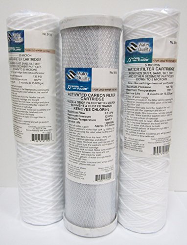 -. Brand : Supply Guru -. Color : White -. EAN : 0728943619379 -. Feature : For Taste and Odor • Removes Chlorine • Individually Shrink Wrapped with Color Label / 5 Micron Filtration • Complete with Washers to Seal Top and Bottom in Housing / Wound String Type for Best Flow • Fits All Standard 10 / 1 X Standard Carbon Filter Cartridge / 1 X Sediment Filter Cartridges 5 Micron 1 X Sediment Filter Cartridges 30 Micron -. Label : Aqua Plumb -. Manufacturer : Aqua Plumb -. ProductGroup : Home Improvement -. ProductTypeName : PLUMBING_FIXTURE -. Publisher : Aqua Plumb -. Studio : Aqua Plumb -. Title : Water Filter Replacement - Standard Carbon Filter Cartridge, Removes Chlorine & Sediment Filter Cartridges - 5 Micron - 30 Micron Set -. UPC : 728943619379