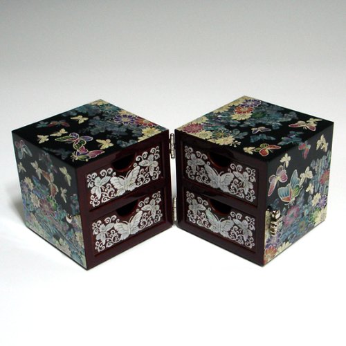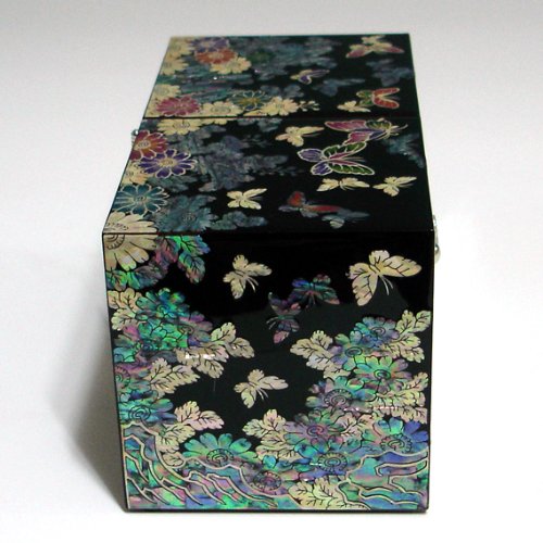 -. Binding : Kitchen -. Brand : Antique Alive Jewelry Box -. EAN : 0662425855865 -. Feature : Beautiful design and iridescent colors of mother of pearl / Individually handcrafted with unique Korean traditional mother of pearl inlay technique that have lasted 1,000 years / Size: 7.1"W x 3.5"D x 3.5"H (18 x 9 x 9cm) -. Label : Antique Alive -. Manufacturer : Antique Alive -. PackageQuantity : 1 -. ProductGroup : Home -. ProductTypeName : HOME -. Publisher : Antique Alive -. Studio : Antique Alive -. Title : Mother of Pearl Black Butterfly and Flower Design Wooden Twin Cubic Jewelry Trinket Keepsake Treasure Lacquer Box Case Chest Organizer -. UPC : 662425855865