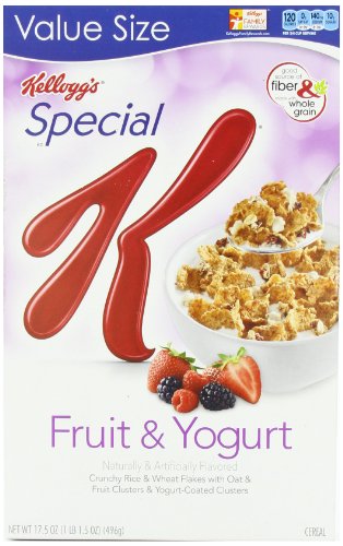-. Feature : Pack of four, 17.5-ounce boxes of Special K Fruit & Yogurt Cereal / Filled with rice and whole grain wheat flakes / With yogurt-covered fruit and oat clusters / 3 grams of fiber and 120 calories per 1-cup serving / A vitamin-fortified breakfast cereal for a healthy start to the day