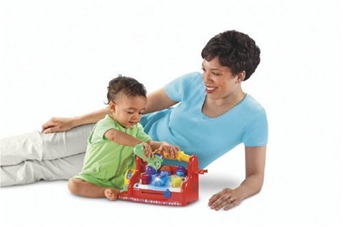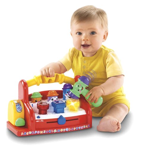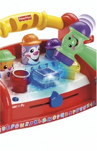-. Feature : Lights dance and three charming characters pop up when baby taps colorful shapes on the tool bench / Teaches A-B-C's, numbers, counting, colors, and shapes / Pull the tape measure to sing the alphabet, slide the ruler to learn colors and shapes / Convenient carry handle / Requires 3 AA batteries (not included)