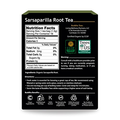 -. Title : Organic Sarsaparilla Tea - Kosher, Caffeine Free, GMO-Free - 18 Bleach Free Tea Bags
