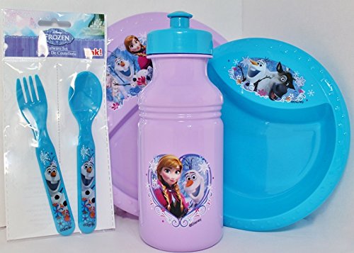 Product Description Frozen BPA FREE Dining Bundle contains 4 items: Plate, Bowl, Water Bottle and Utensils. Grab a few Disney Princess Dinner sets for all the Frozen Fans in your home! Fun and bright set adds a little magic to mealtime at school and at home. 0