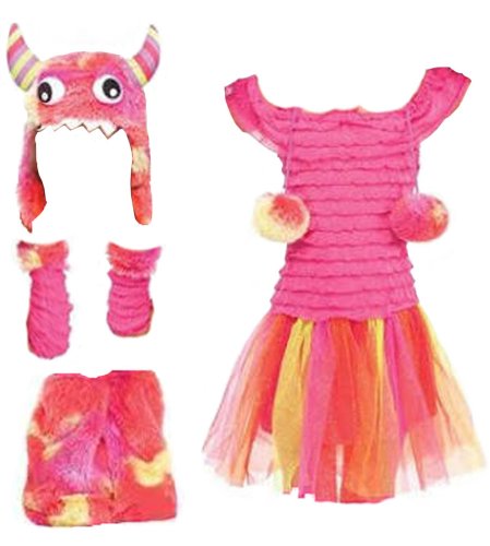 -. Feature : Complete set; hot pink dress with tattered tutu skirt / Monster face hood, arms mitts and furry boot covers / Made of polyester and spandex / Yellow, orange, red and pink sparkly tulle / Tie dye effect on hood, furry, boot covers, and pompoms
