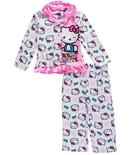 Little girls all over will love this adorable Hello Kitty 2-Piece Pajama set. This cute & girly set features a long sleeve button down top with a friendly Hello Kitty giving her signature wink. The pink collar and hem feature ruffles and glimmering polka dots. Pink stars, blue head bows and hello kitty graphics cover the top and matching pants. This set is 100% Polyester so your little one will be able to stay comfy and warm while looking stylish.Feature