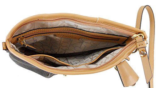 -. Brand : -. Color : Brown Khaki Camel -. Department : womens -. Feature : Color: Brown/Khaki/Camel; Material: PVC / Zip closure; Front Logo plaque; Seaming details / Dimensions: 10" wide x 10.5" tall x 2.5" deep; 23" shoulder drop / Exterior front pocket with snap closure / Interior features 1 zip close pocket; 2 slip pockets -. PackageQuantity : 1 -. ProductGroup : Shoes -. ProductTypeName : HANDBAG -. Size : Medium -. Title : Handbag, CK Logo Monogram Crossbody