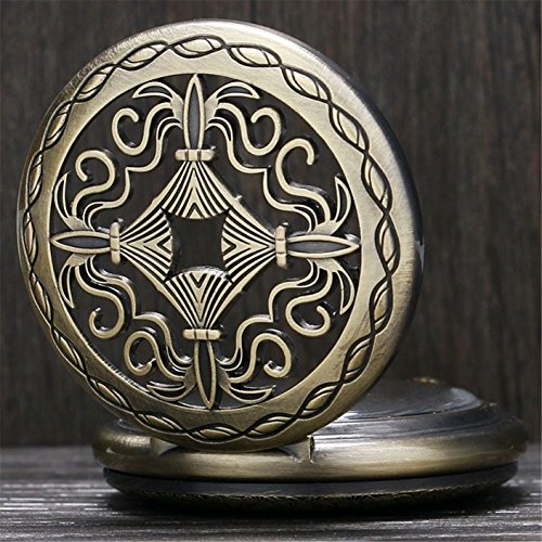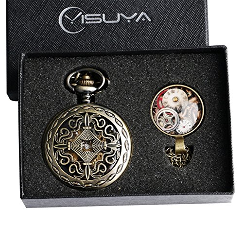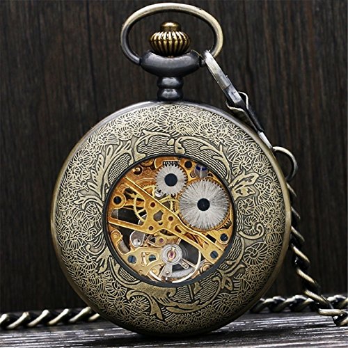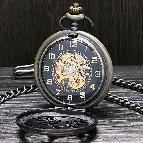 -. Title : Men's Vintage Bronze Cross Skeleton Mechanical Half Hunter Steampunk Pocket Watch Chain Gift Set Box