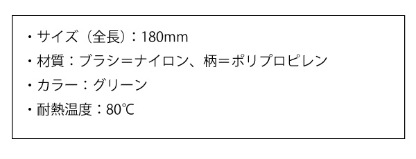 ●【品質表示】・柄:材質…ポリプロピレン(抗菌剤含有)、耐熱温度…80℃・毛:材質…ナイロン(毛のかたさ:やわらかめ)、耐熱温度…80℃【使用上の注意】・舌を強くこすらないでください。
