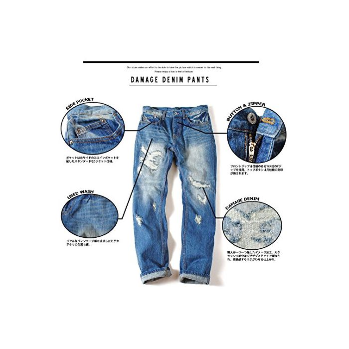 FLG(풀《구로우》) 12oz 데미지 데님 팬츠 진즈 크래쉬 데님 (L,85 네이비)