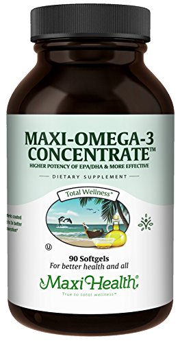 Maxi Health Research is proud to provide you with Maxi Omega 3 Concentrate. This fish oil is encapsulated in 90 enteric coated , kosher soft gels. Easy to digest and has no aftertaste. Enteric coating is a barrier applied to a capsule that protects from breakdown in the acidic environment of the stomach, but will breakdown rapidly in the alkaline environment of the small intestines. No fishy aftertaste, breath, or gastrointestinal discomfort. Maxi Omega 3 Concentrate is pure and potent, supplying you with 700 mg of EPA (Eicosapentaenoic Acid) and 440 mg of DHA (Docosahexaenoic Acid) per serving. Don’t leave Omega-3 levels to chance. Take Maxi Omega 3 Concentrate with D3 every day.Feature