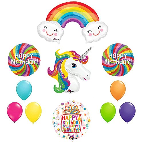 With this kit you will receive: (1) 33" Rainbow Unicorn Head foil balloon, (1) 37" Rainbow With Happy Clouds foil balloon, (1) 26" Birthday Present See-Thru balloon, 18" Rainbow Swirl Round Happy Birthday foil balloon, (6) 11" Assorted Rainbow Colored Latex balloons. Just add Helium and Enjoy!