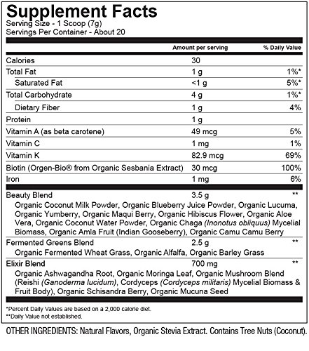 ReleaseDate : 2017-05-17 Studio : Amazing Grass Publisher : Amazing Grass Binding : Grocery Product Description Elixir Beauty Blend 20 Serving 4.9 oz PowderProduct Descriptions Supports radiant hair, skin and nails IngredientsCoconut Milk, Blueberry Juice, Lucuma,MaquiBerry, Yum Berry, Hibiscus Flower,Aloe Vera, Coconut Water,Chaga MycelialBiomass,Alma Fruit (Indian Gooseberry),Camu Camu Berry - Easy to digest Berman did greens blend of wheatgrass, barley and alfalfa grown on her own family farm in Kansas