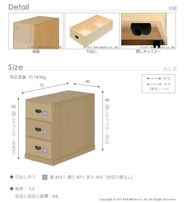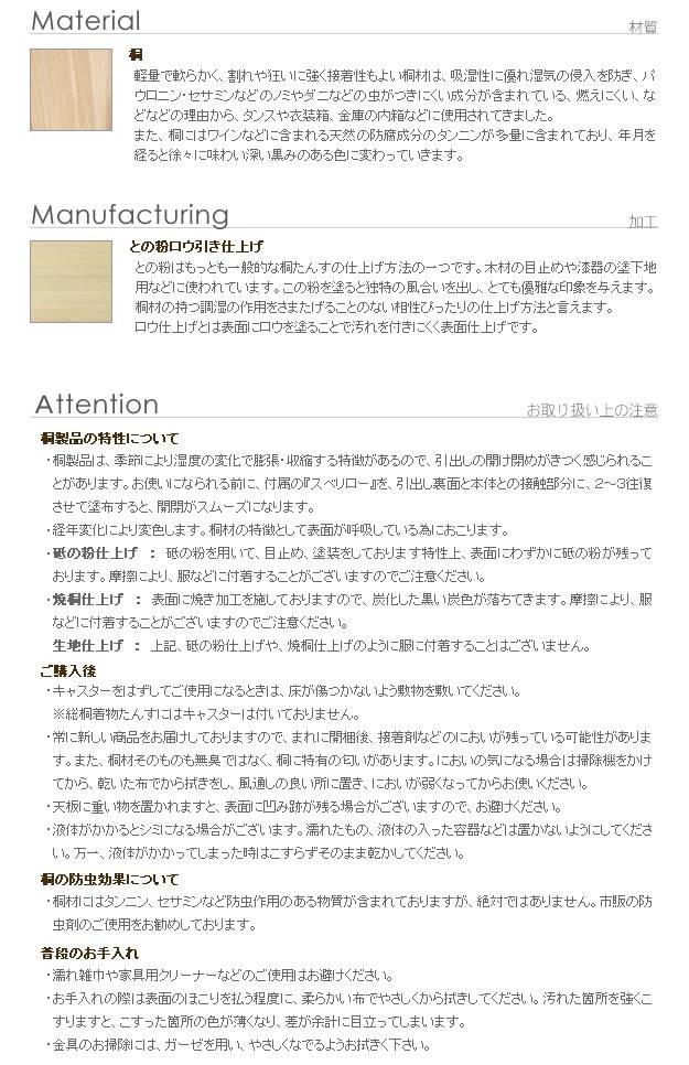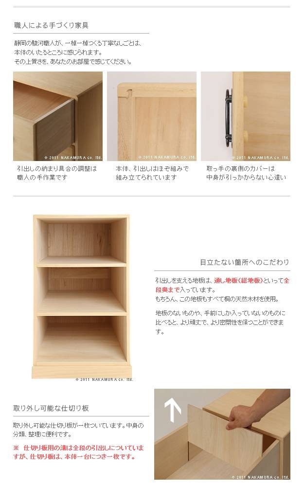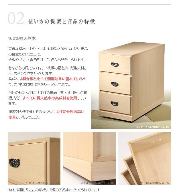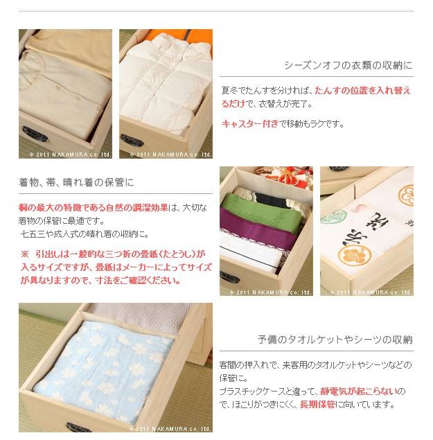 商品について:こだわりの国産桐たんす。桐本来の調湿機能で衣類の収納に最適です。押入れの限られたスペースでも使いやすいコンパクトなサイズ。キャスター付きで移動が簡単です。仕切り板1枚付きで引出し内の区分け収納に便利です。汚れのつきにくいとの粉ロウ引き仕上げ