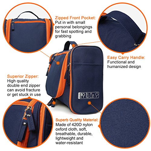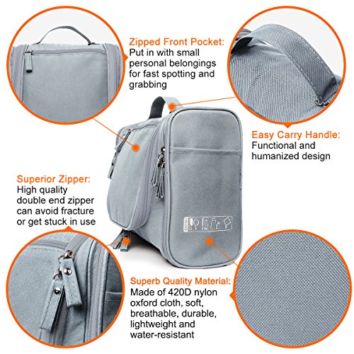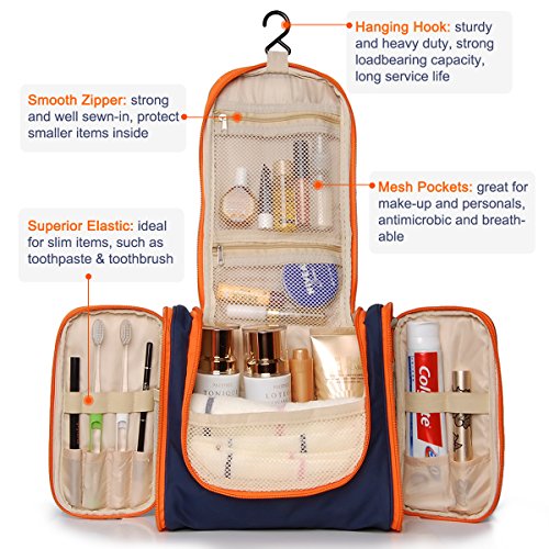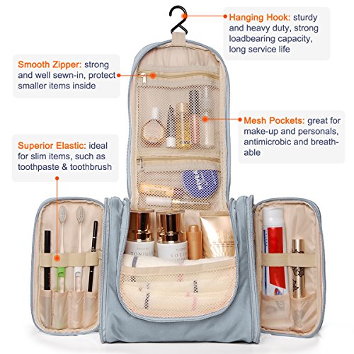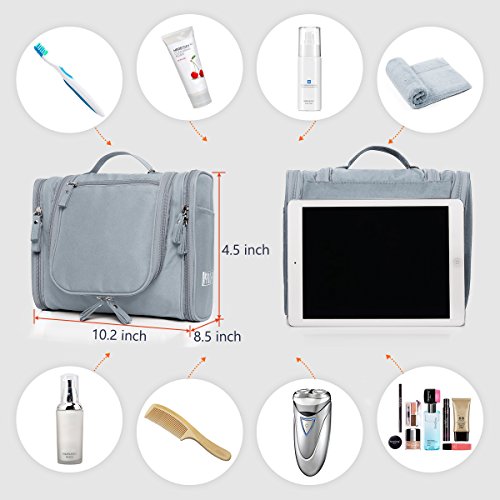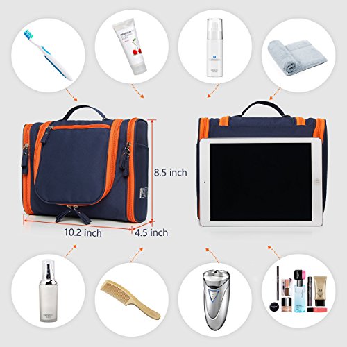-. Brand : Hokeeper -. Department : unisex-adult (lage only) -. Feature : DURABLE MATERIALS: This toiletry bag is made of Superb Quality 420D Nylon Oxford cloth and Waterproof Coating to withstand common bathroom toiletries. This lightweight durable water-resistant fabric is convenient to wipe clean and dry easily after hanging in the shower. The stitching is well sewn and reinforced at all stress points. The zippers all operate smoothly. / LARGE CAPACITY: Size: 10.2 x 4.5 x 8.5 inches. Multiple compartments and mesh pockets make the bag functional and highly organized. Excellent capacity can meet your different needs. You can put your make-up, shampoo, soap, toothbrush, toothpaste, shaving kit and so on, all in one place. Keep your travel comfortably and easily to have all your necessities in one bag. / MULTI-USE: Built-in heavy duty hanging hook allows more easier hanging and access on the bathroom door, shower rod or towel rack. Durable carrying handle is convenient to carry or hung up. It can be folded very easily and thinly when not in use, to save space. Ideal for business trip, vacation, gym, makeup, outdoors activities, picnic, bathroom organization and more. / UPDATED VERSION: Add one more zipped pocket in the front and an open bag in the back of the toiletry bag. You can put in with facial masks, mirror or any other small personal belongings for fast spotting and grabbing with no effort. / LIFETIME WARRANTY! Don't waste your money and time on other flimsy toiletry bags if you have a lot of stuff to carry. We guarantee good after-sale service for this item. Please rest assured to buy! -. IsAdultProduct : 0 -. Model : TMB -. MPN : TMB -. PartNumber : TMB -. ProductGroup : Apparel -. ProductTypeName : LAGE -. Title : Heavy Duty Hanging Toiletry Bag - Travel Cosmetic Makeup Bag for Women & Shaving Kit Organizer Bag for Men - Large Size: 10.2 x 4.5 x 8.5 Inch