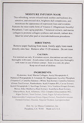 -. Binding : Health and Beauty -. Brand : Le Mieux -. EAN : 0852668532153 -. Feature : Formulated with the most stable form of Vitamin C (Magnesium Ascorbyl Phosphate), / The mask brightens dull complexions and provides a unique cooling sensation / Features 3 anti-aging peptides, 8 botanical extracts, and marine collagen / Formulated with the most stable form of Vitamin C (Magnesium Ascorbyl Phosphate) -. Label : Le Mieux -. Manufacturer : Le Mieux -. NumberOfItems : 1 -. PackageQuantity : 1 -. ProductGroup : Beauty -. ProductTypeName : BEAUTY -. PublicationDate : 2015-11-20 -. Publisher : Le Mieux -. ReleaseDate : 2015-11-12 -. Studio : Le Mieux -. Title : Le Mieux Moisture Infusion Mask, 4 Count -. UPC : 852668532153