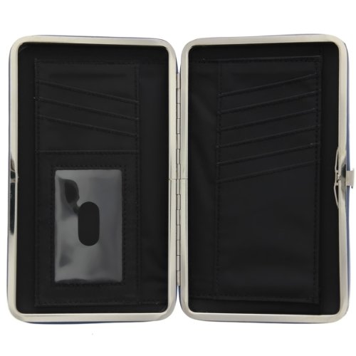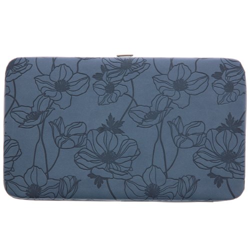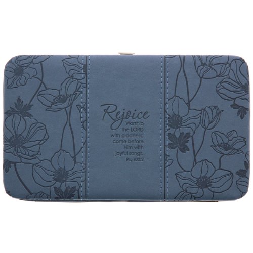The "Rejoice" Blue Opera Wallet is large enough to carry keys and a lipstick, elegant enough to use for dress occasions and functional enough for every day! It features an airy blossom design debossed into the supple cornflower blue, faux leather body, and artfully debossed Scripture from Psalm 100:2. The hinged metal frame clutch wallet is padded for a firm, comfortable grip and features a simple push button for opening. Inside you'll find an ID card window, 9 card slots, a pocket for currency, receipts, slips, etc., and a flip divider. The wallet is constructed of quality man-made material imported from Italy, with the look and feel of real leather (trade name LuxLeather). Polyester Lining.